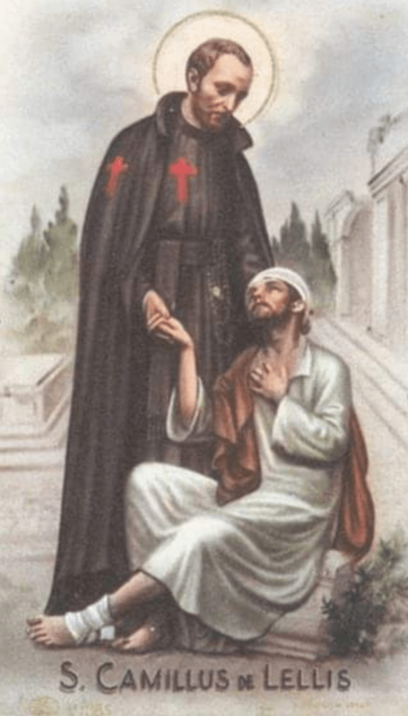 He was born in Italy of a noble family. He became a soldier but his taste for gambling and riotous living eventually lost him everything. At the age of 25 he converted as the result of hearing a sermon. He twice tried to join the Capuchin friars but was rejected because of his poor health. Having had experience of hospitals from the inside, he determined to improve them, and he devoted the rest of his life to the care of the sick. He offered himself to the hospital of San Giacomo in Rome and eventually became its bursar. Hospitals were filthy, and staff were brutal and inadequate. He introduced many reforms and founded a congregation of priests and lay brothers, the Servants of the Sick (later known as the Camillians) to serve the sick both spiritually and physically. He was ordained priest in 1584. He resigned as head of his congregation in 1607 but continued to look after and visit the sick almost until the day of his death.