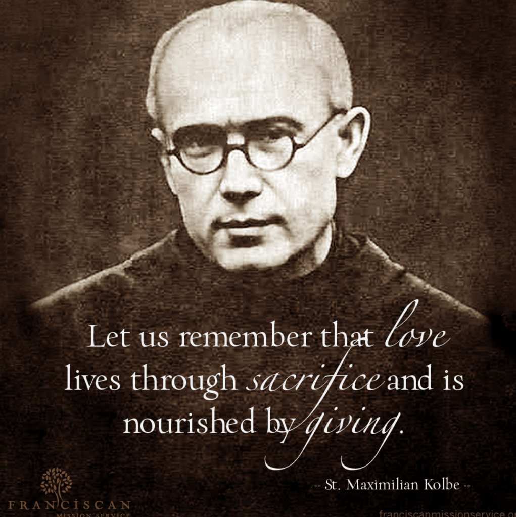 He was at Auschwitz three months when a prisoner successfully escaped. The Nazis made the rest of the prisoners pay for the escape. They chose ten prisoners at random to die in the starvation bunker. All the prisoners stood at attention, while ten men were pulled out of line. One chosen prisoner, a married man with a family, begged and pleaded to be spared for the sake of his children. Father Kolbe, who had not been picked, listened and felt deeply moved to help that suffering prisoner. He stepped forward and asked the commander if he could take the man’s place. The commander accepted his offer.